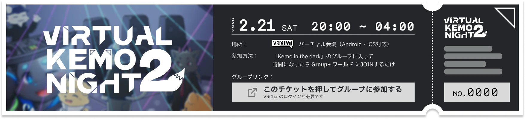 「バーチャルケモナイト2」は、オールナイトのVRChatのDJイベントです。 「VRChatって初めてなんだけど…」「DJイベントってどんな感じ?」 そんな心配はご無用!私たちがノリの良い選曲とパフォーマンスで、アツい一夜をお届けします!